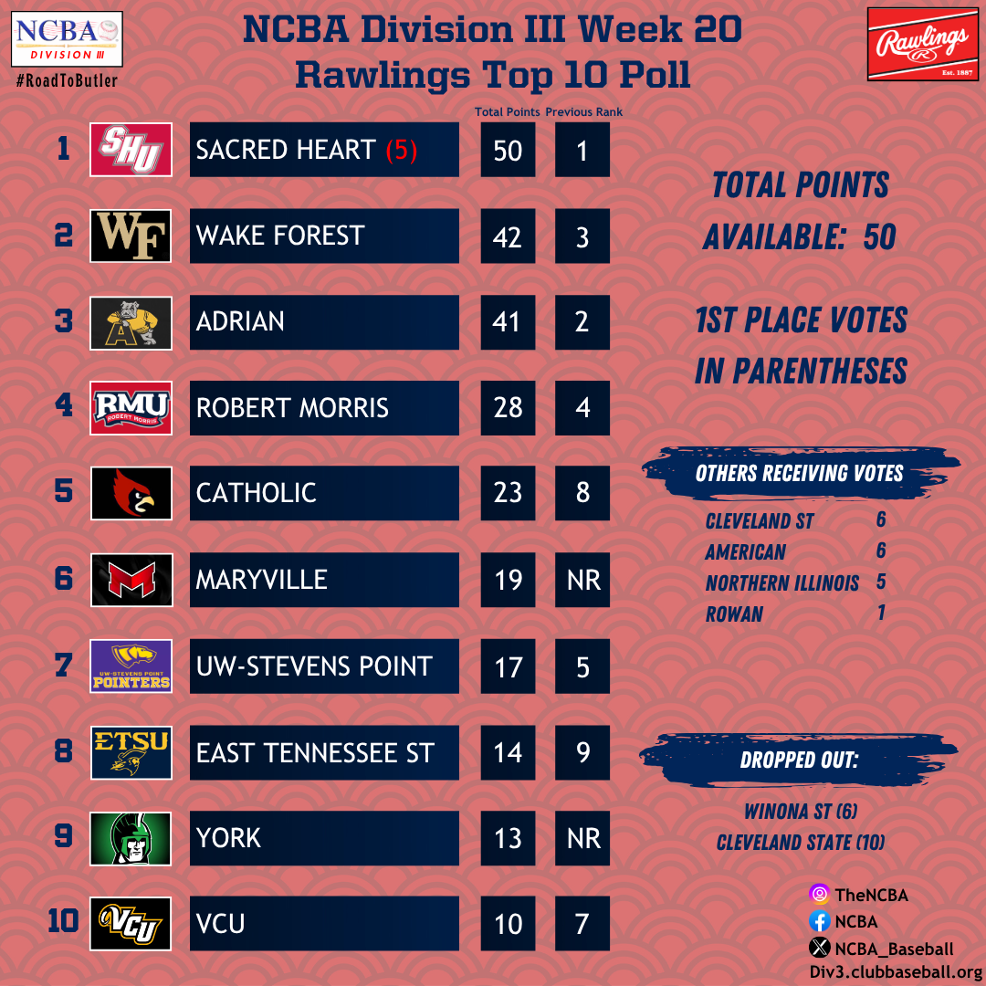 Things are starting to pick up across NCBA Division III as we move further into the season, and there’s been plenty of shake-up in the rankings. Wake Forest has been on a tear, staying undefeated at 10-0 and moving up to the #2 spot. Sacred Heart still holds strong at #1, continuing to set the pace at the top. Elsewhere, Maryville’s solid run has earned them a spot in the Top 10, while York breaks into the rankings after a strong 5-1 start in conference play. With postseason getting closer, every week is starting to matter a little more and the competition is only getting tighter.